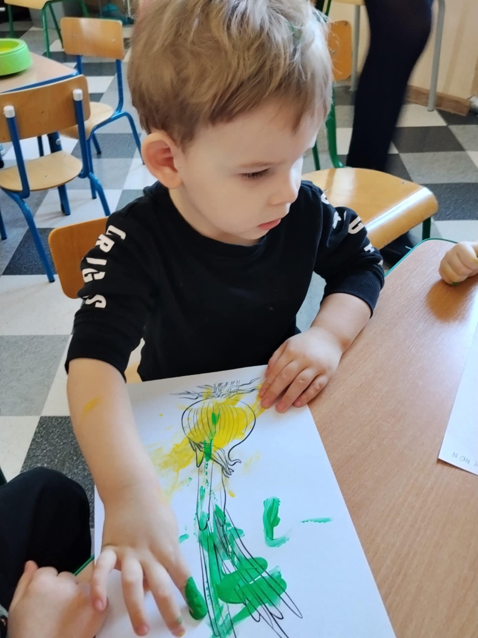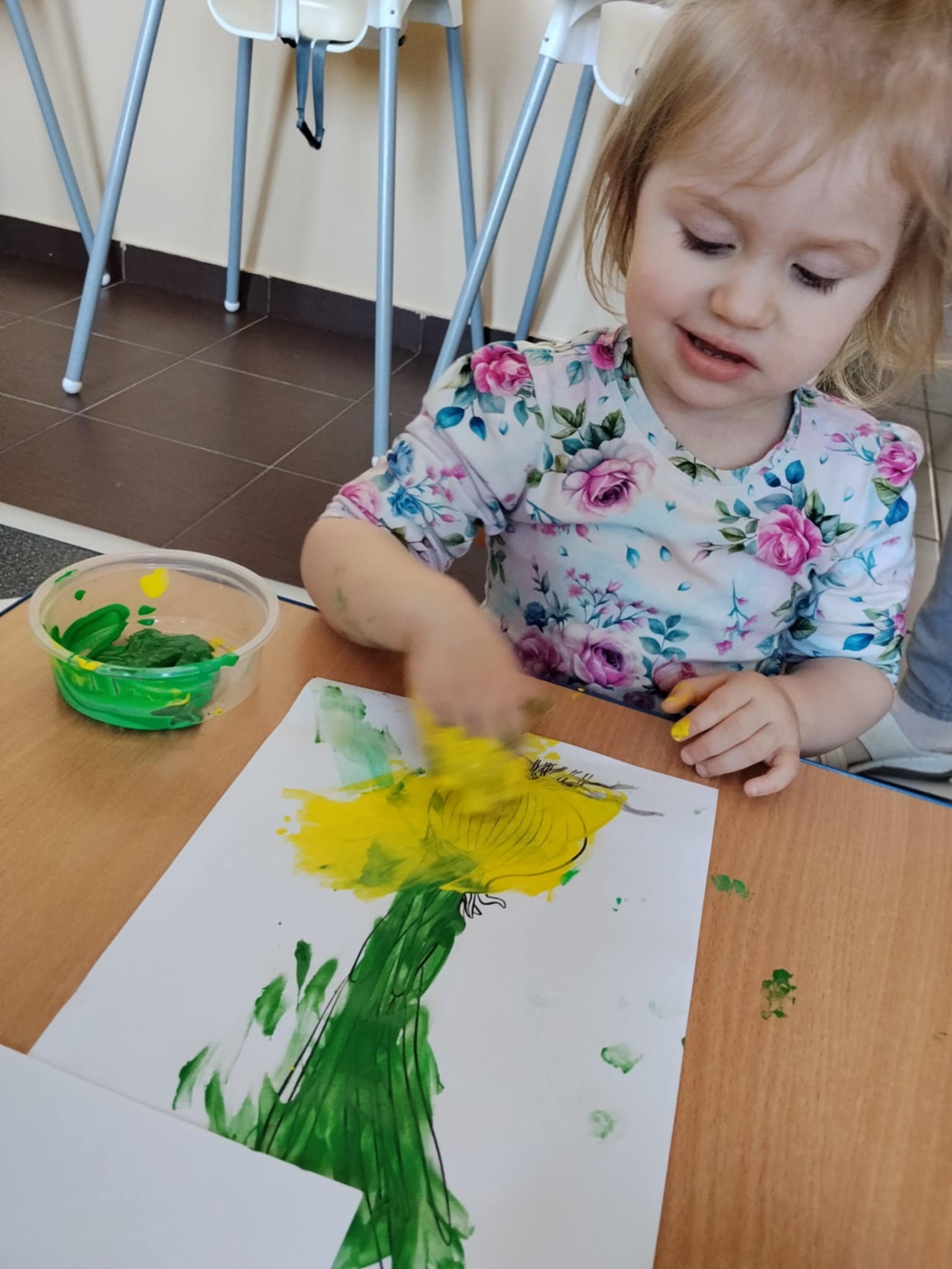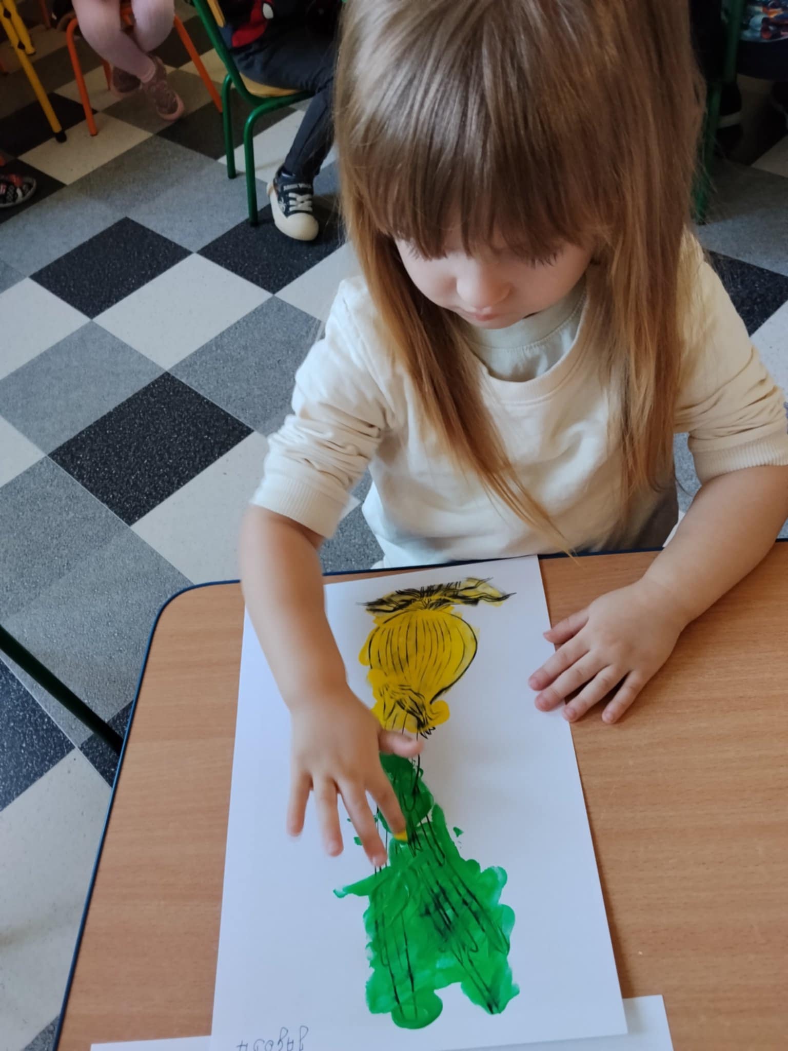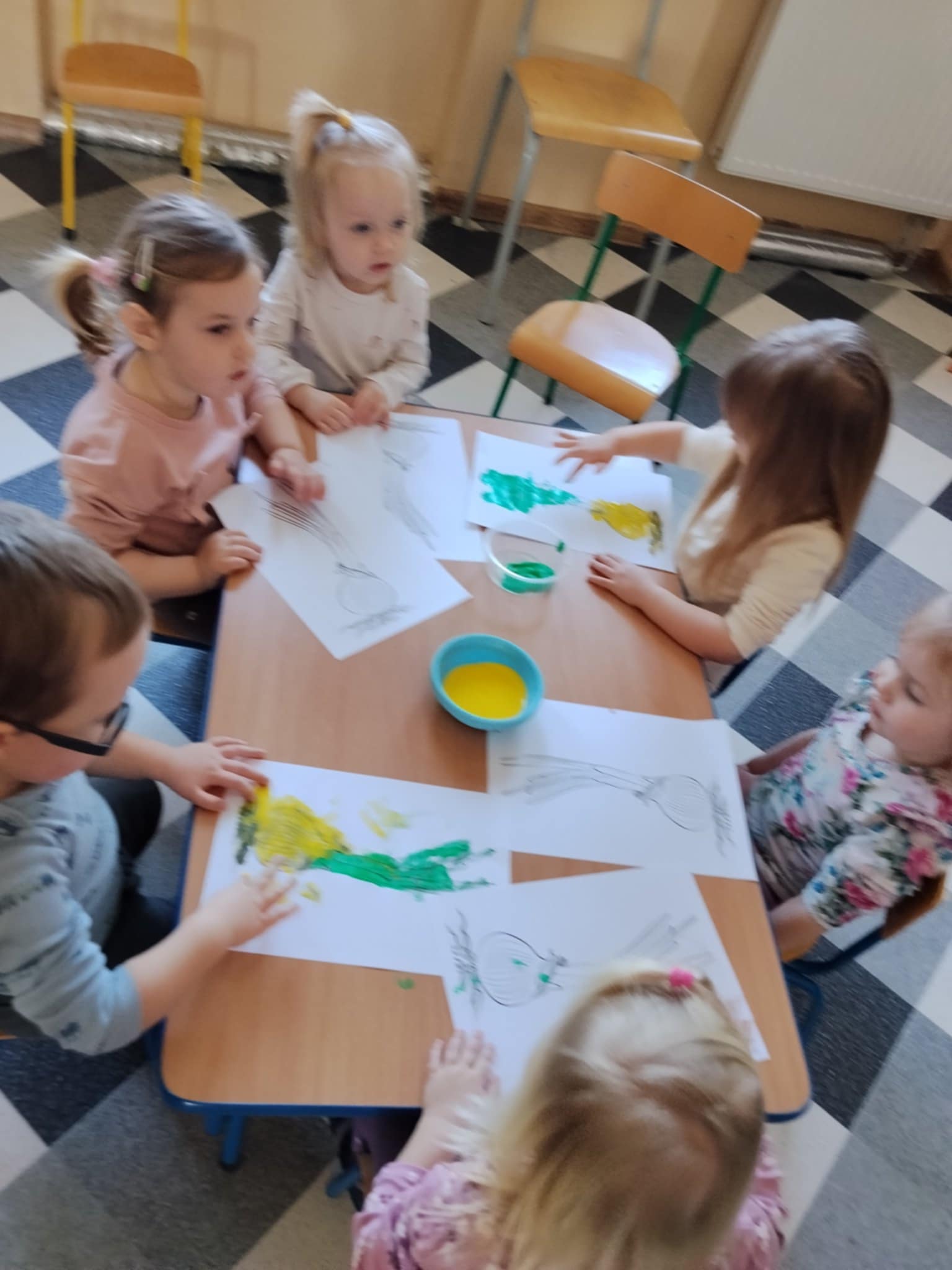 Następnie dzieci maczały paluszki w farbie i tworzyły na kartkach obraz cebulki. Zajęcia sprawiły dzieciom wiele radości oraz pozwoliły rozwijać kreatywność, wyobraźnię i sprawność manualną.