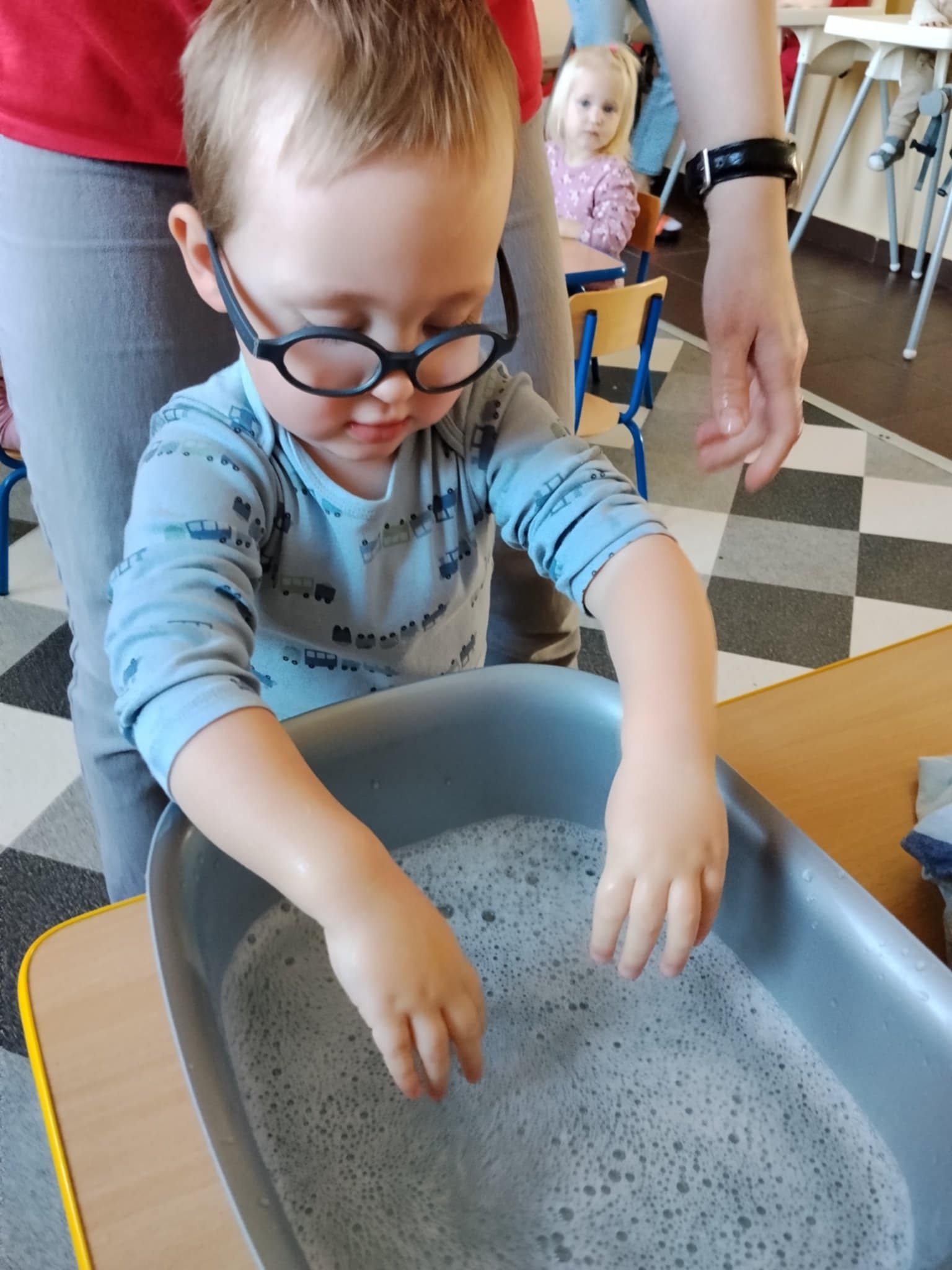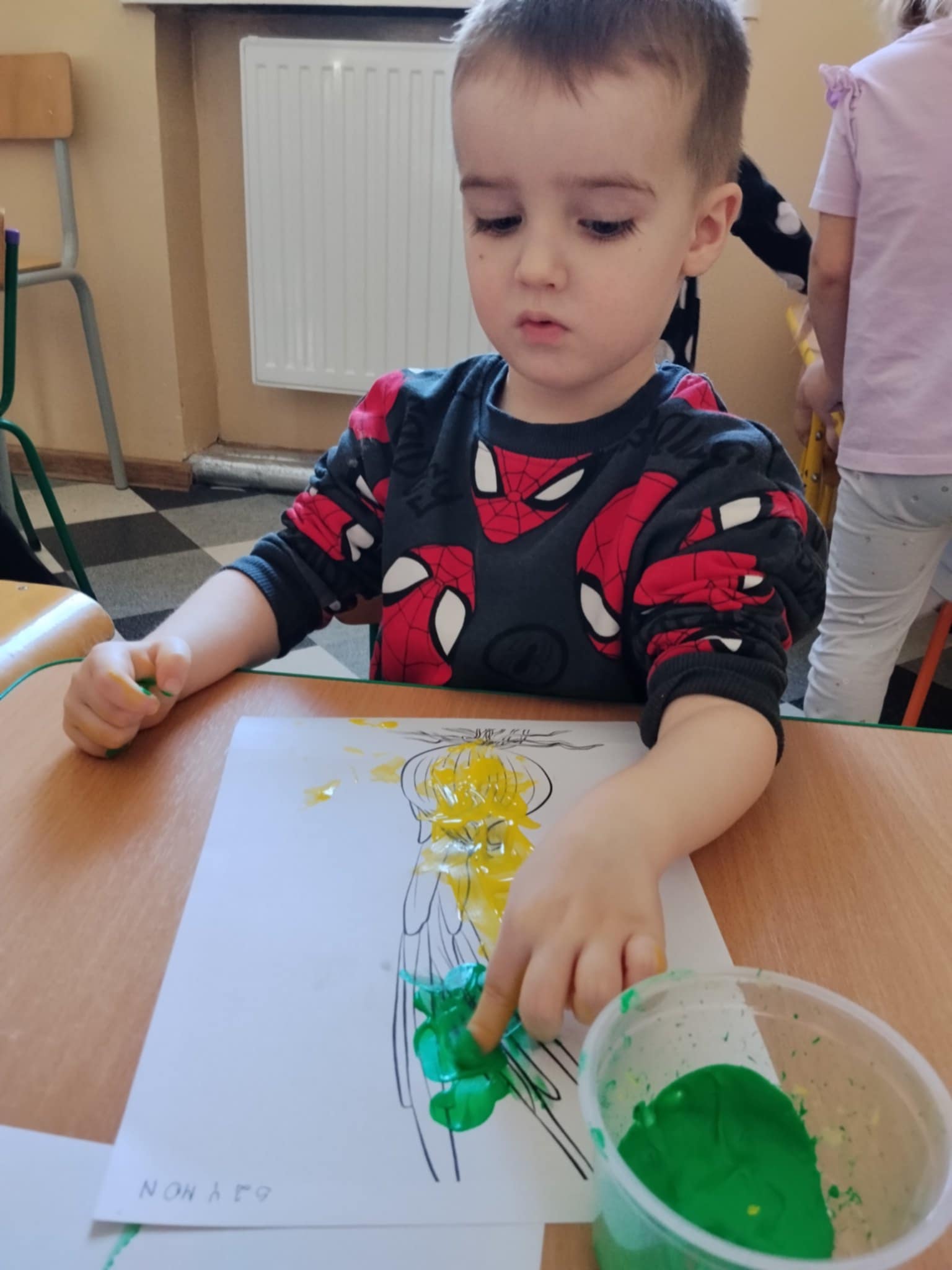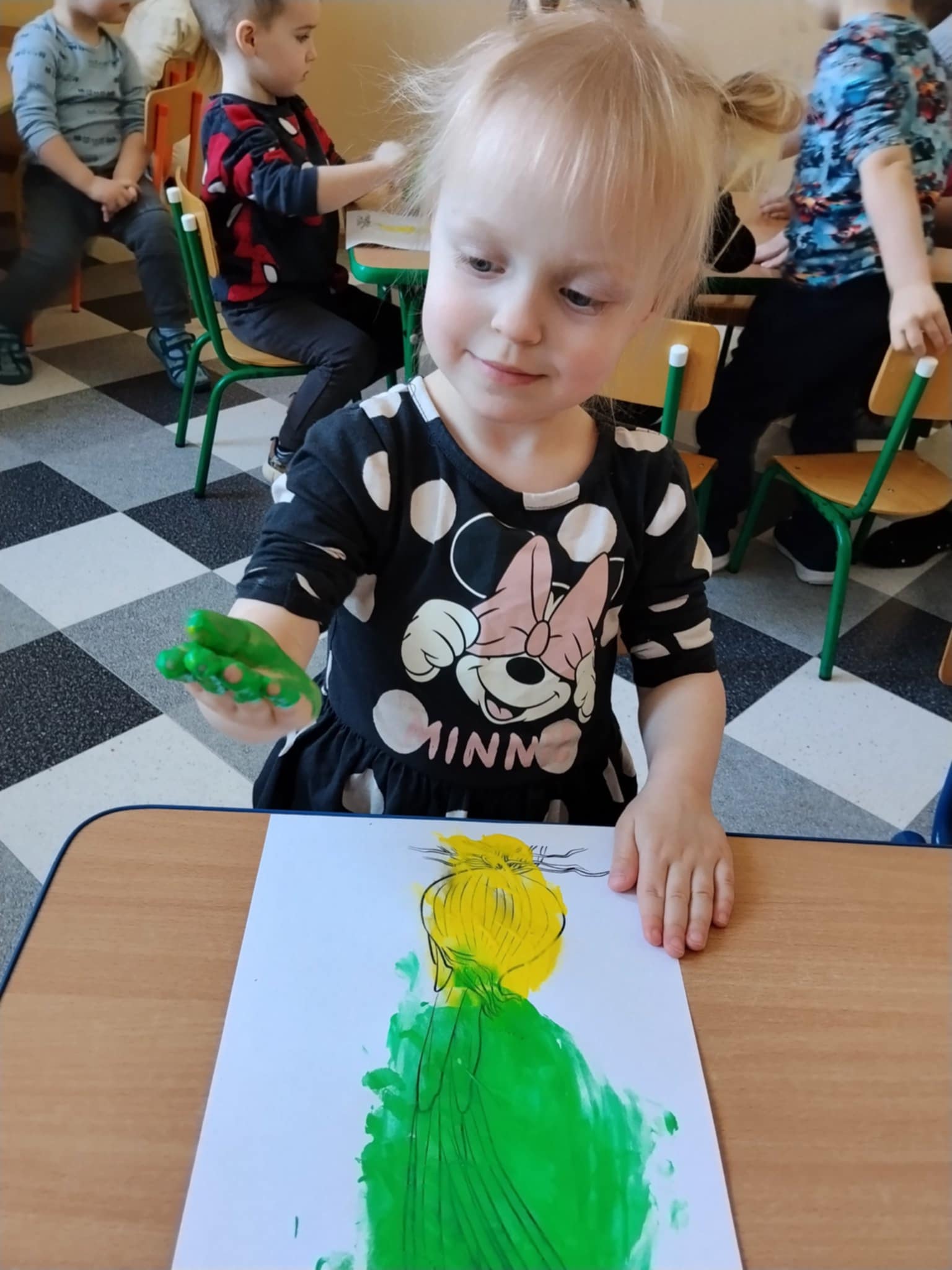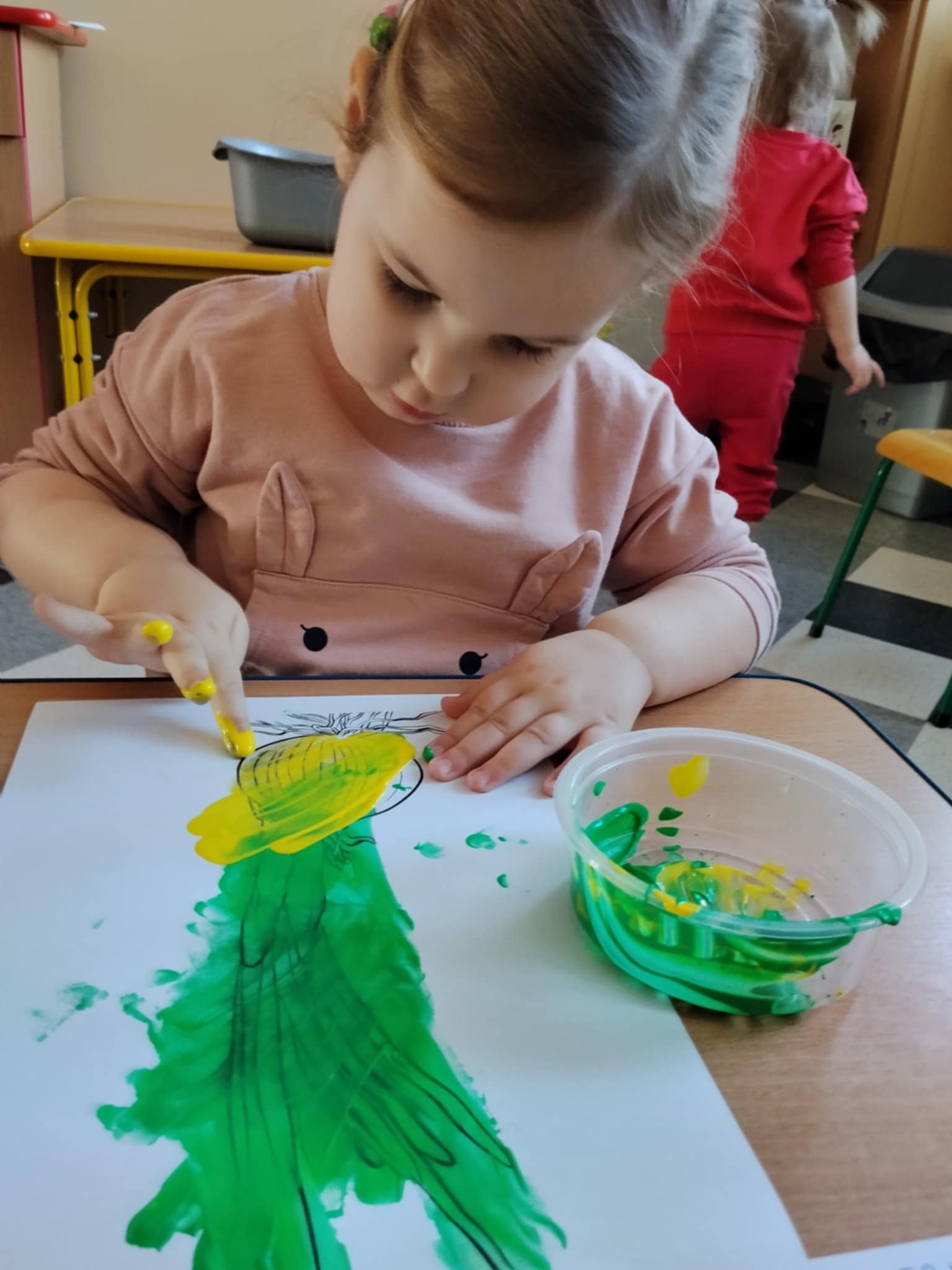 Następnie dzieci maczały paluszki w farbie i tworzyły na kartkach obraz cebulki. Zajęcia sprawiły dzieciom wiele radości oraz pozwoliły rozwijać kreatywność, wyobraźnię i sprawność manualną.