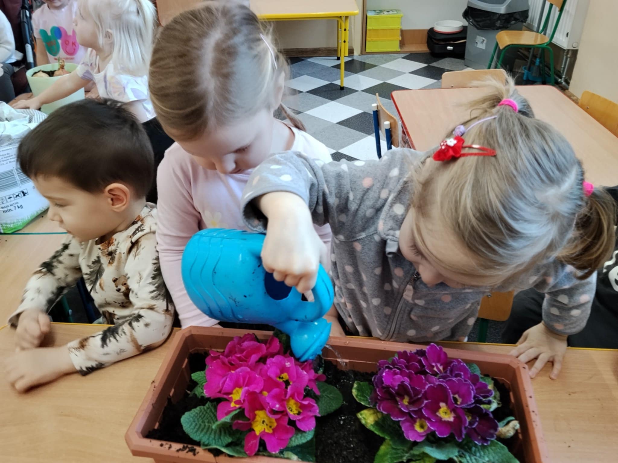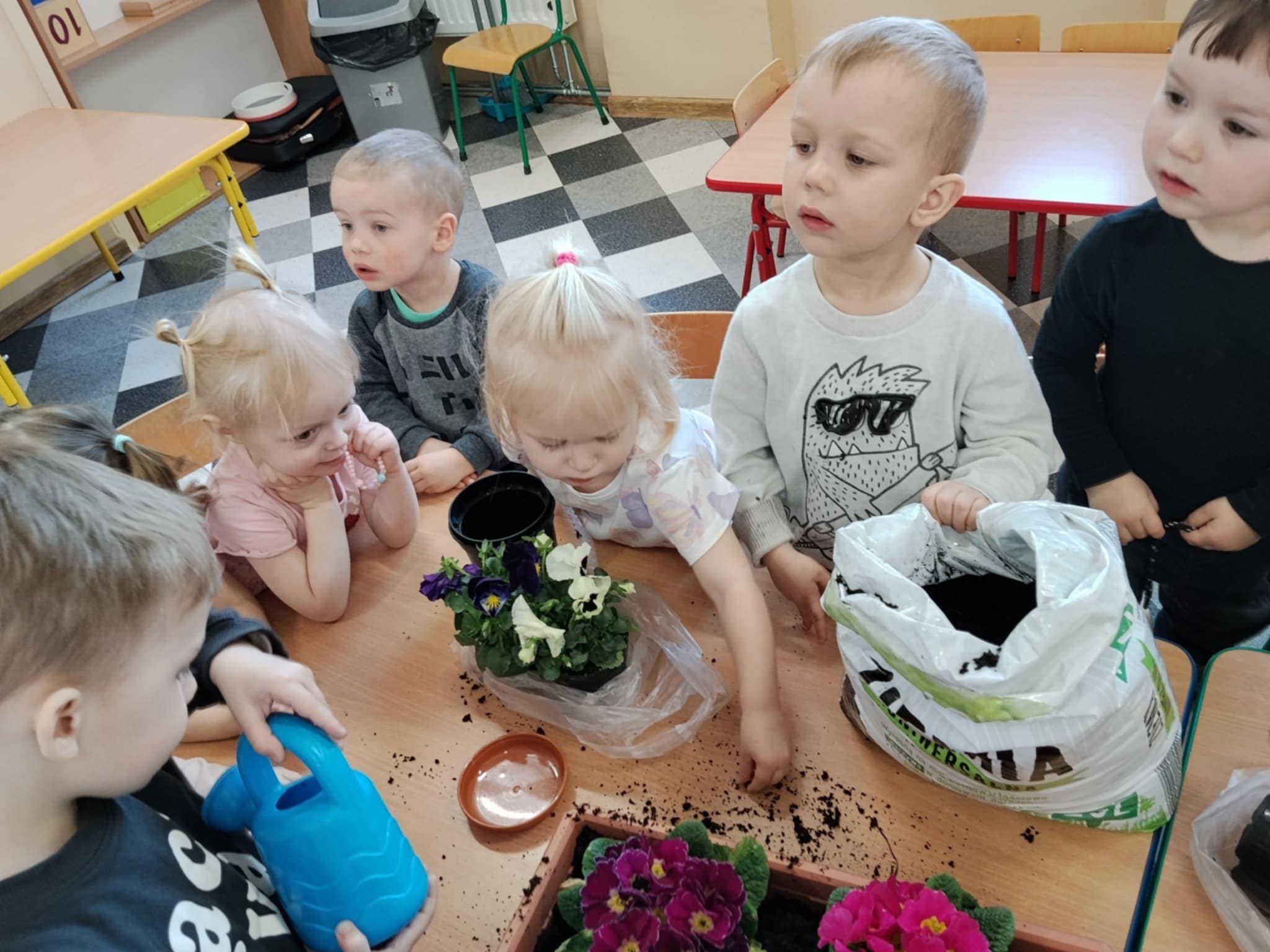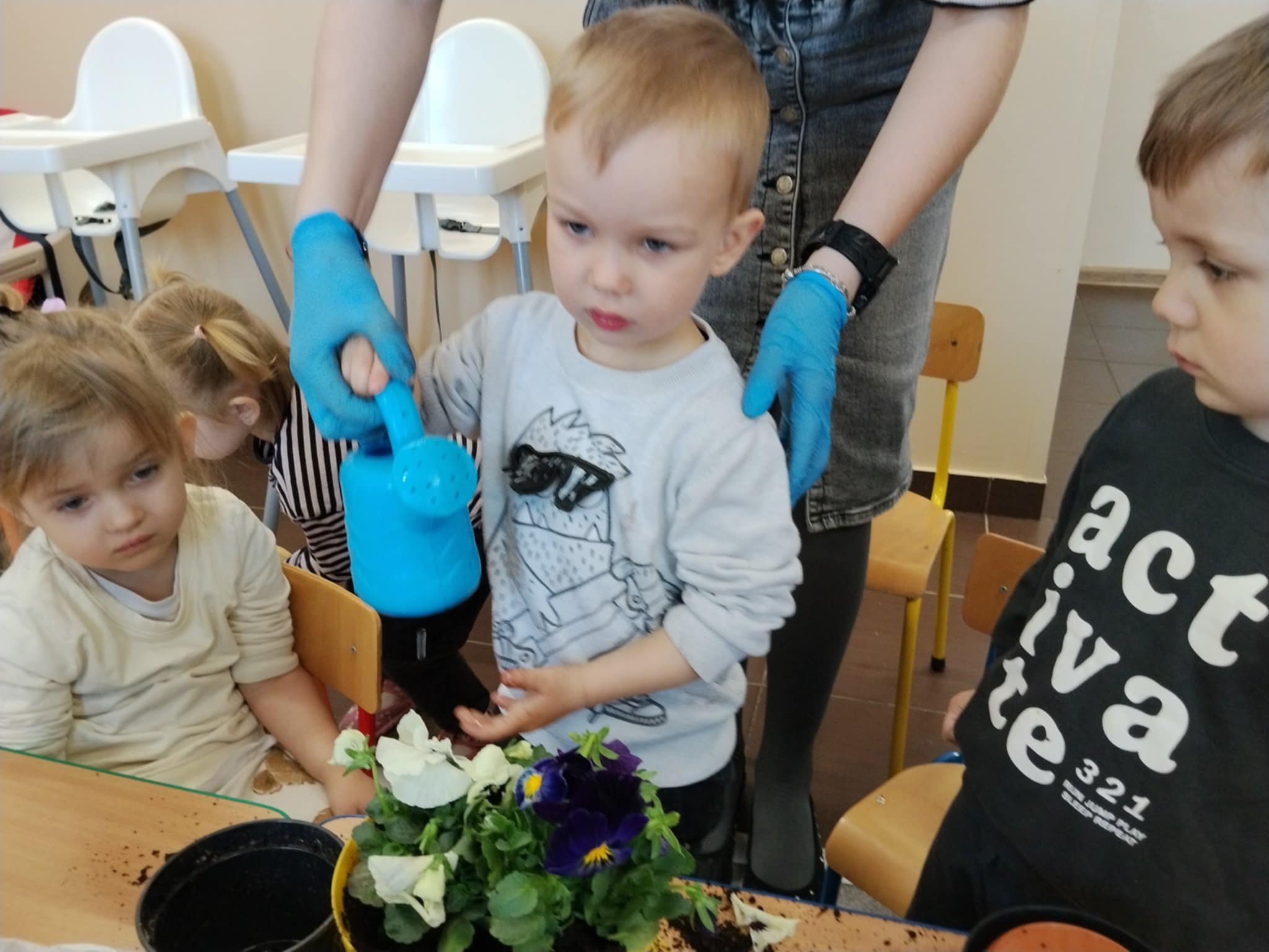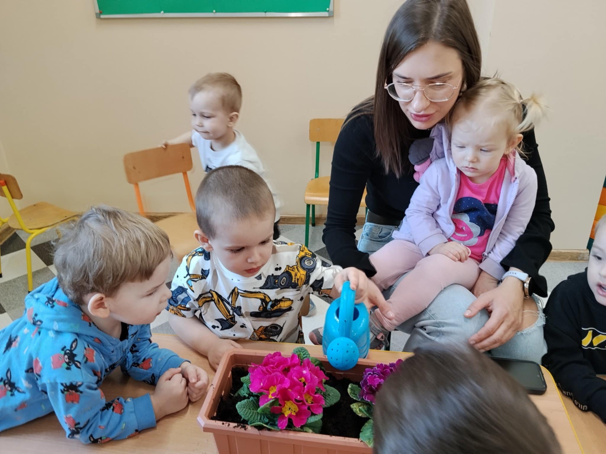 Dzieci poznały, czego potrzebują rośliny do wzrostu – ziemi, wody i słońca. Następnie z pomocą opiekunów sadziły kwiatki do doniczek oraz podlewały je. Było to dla maluchów ciekawe i radosne doświadczenie.