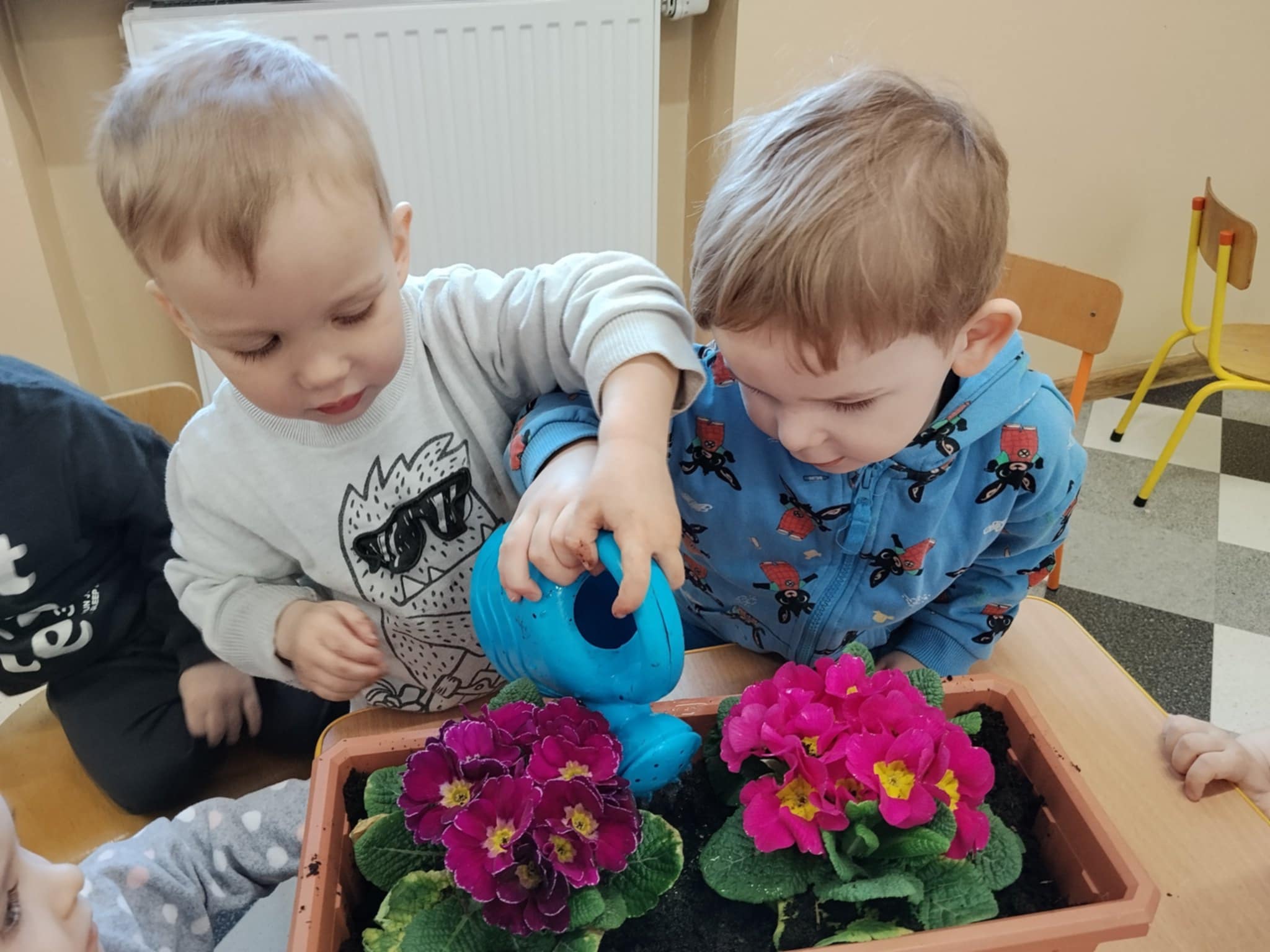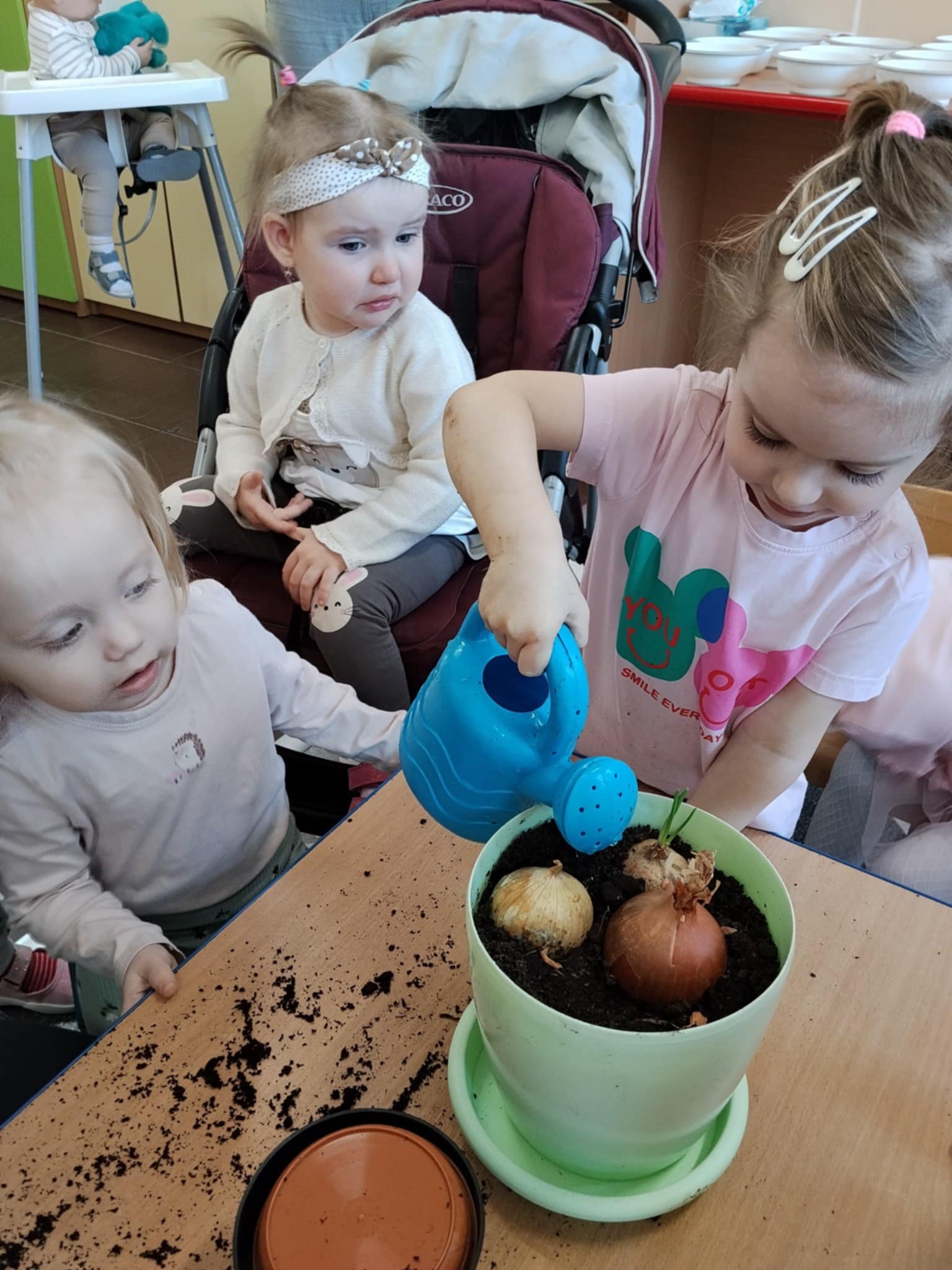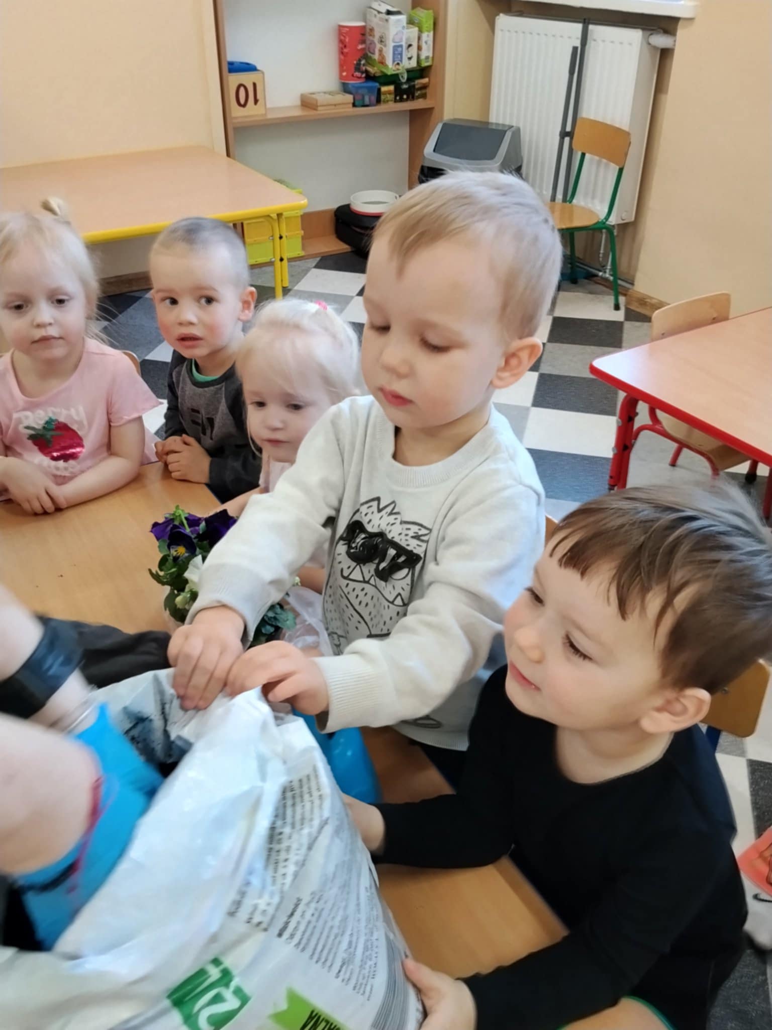 Dzieci poznały, czego potrzebują rośliny do wzrostu – ziemi, wody i słońca. Następnie z pomocą opiekunów sadziły kwiatki do doniczek oraz podlewały je. Było to dla maluchów ciekawe i radosne doświadczenie.
