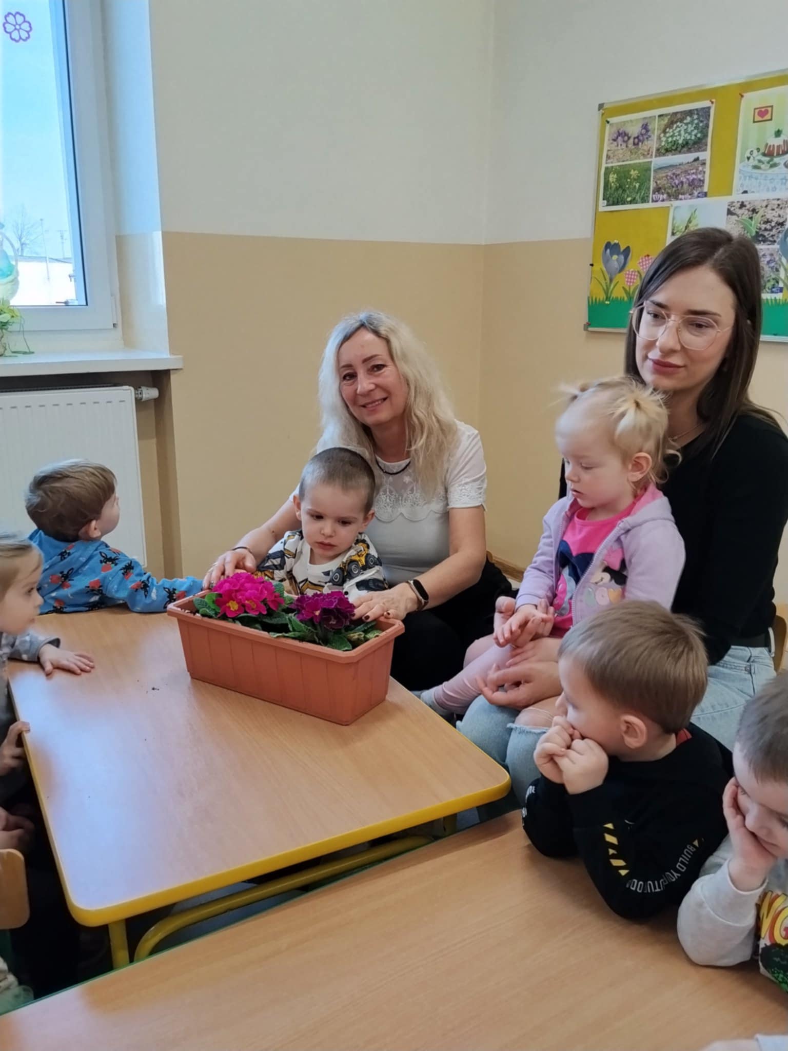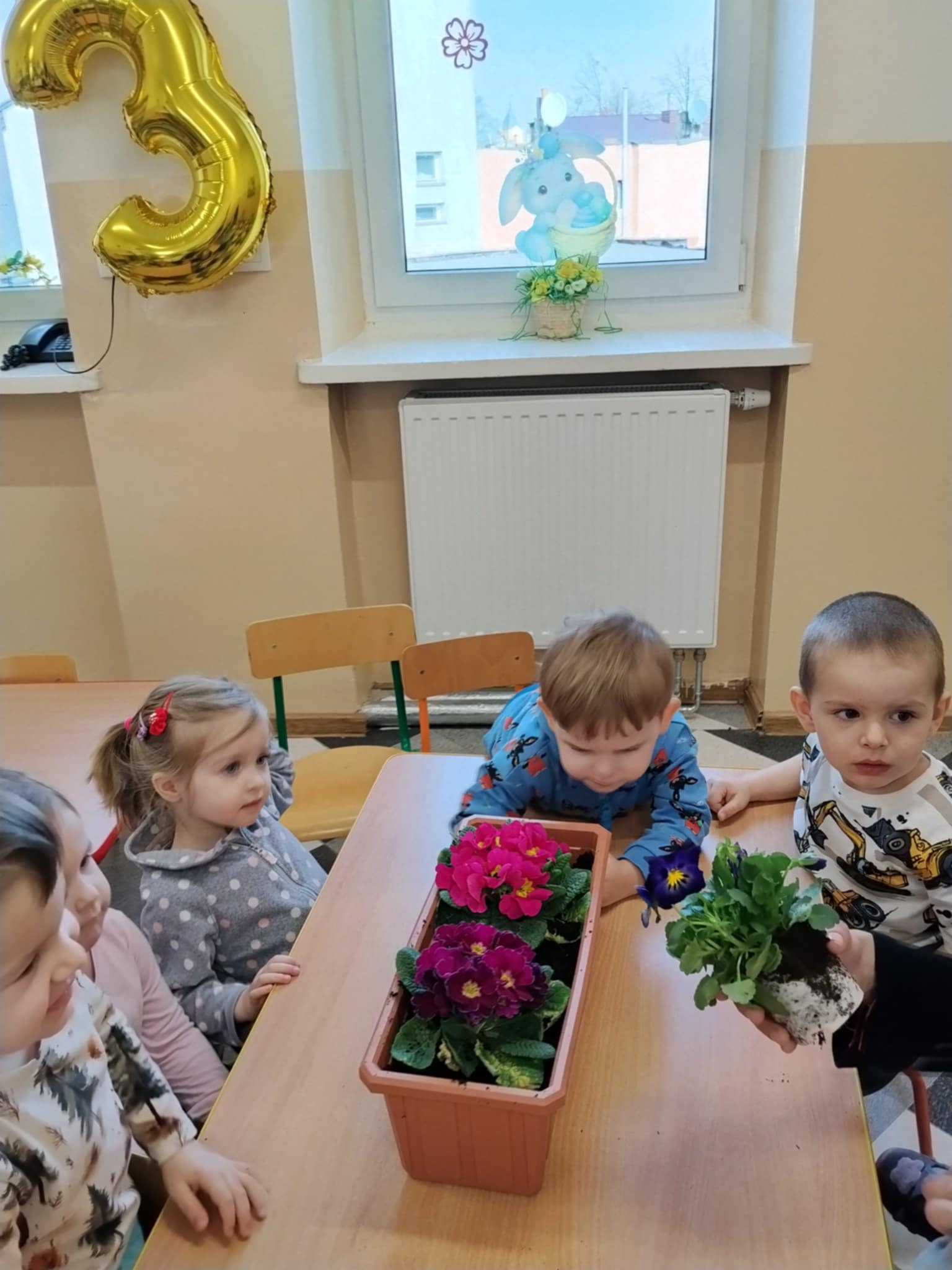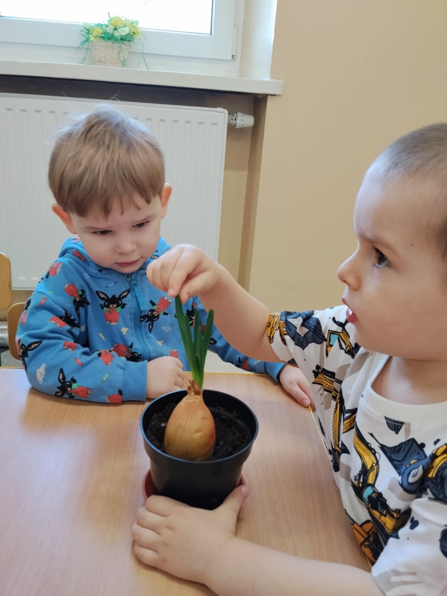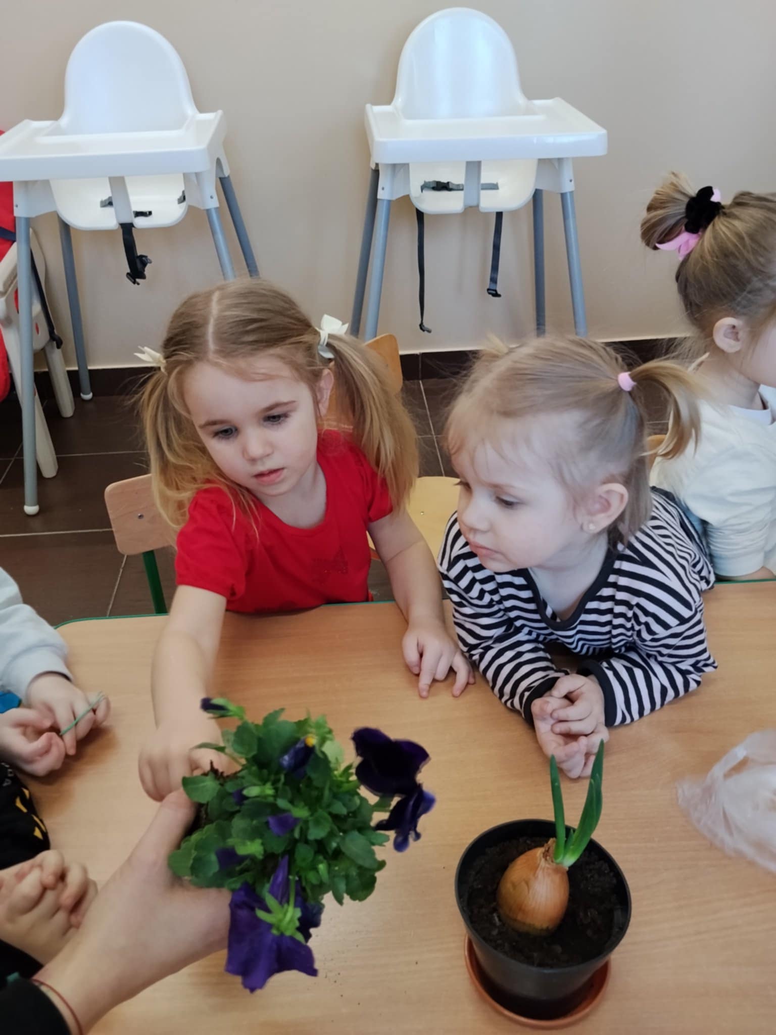 Dzieci poznały, czego potrzebują rośliny do wzrostu – ziemi, wody i słońca. Następnie z pomocą opiekunów sadziły kwiatki do doniczek oraz podlewały je. Było to dla maluchów ciekawe i radosne doświadczenie.